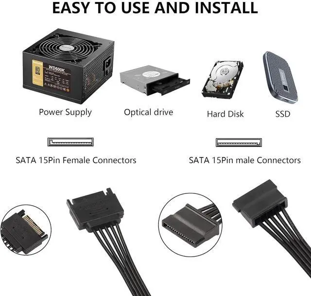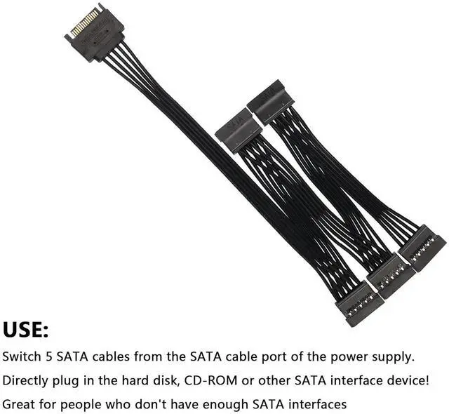 COMPATIBILITY15 Pin SATA to 5 SATA Power Splitter Cable,Compatible with 2.5-inch SSD/3.5-inch hard drives/optical drives, CD Drives, optical DVD Drives, Bluray Drives,etc.
