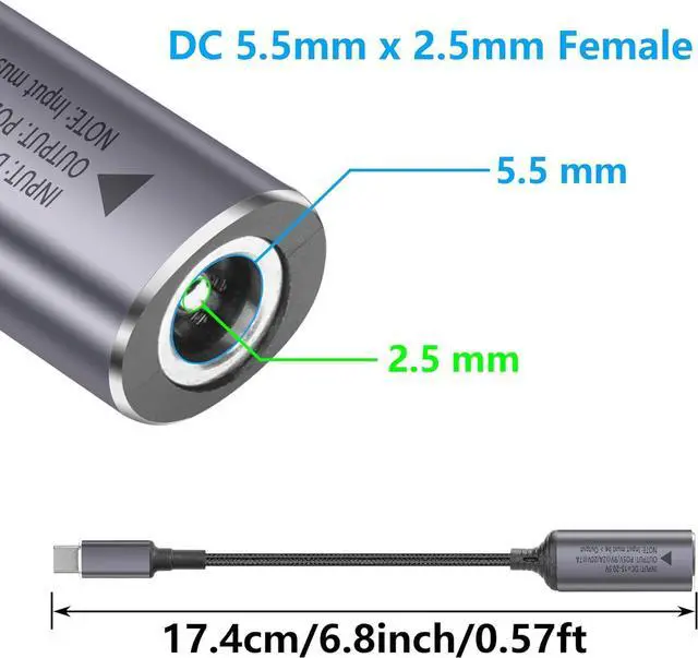 High Quality MaterialDC to Type-c connector head adopts high-quality metal,injection molding.Wire body adopts nylon braided material, and pure copper inner core. Cable length: 17.4cm/6.8inch/0.57ft.
