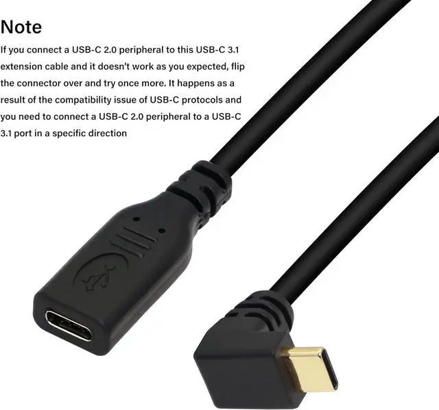 NOTEIf you connect a USB-C 2.0 peripheral to this USB-C 3.1 extension cable and it doesn't work as you expected, flip the connector over and try once more. It happens as a result of the compatibility issue of USB-C protocols and you need to connect a USB-C 2.0 peripheral to a USB-C 3.1 port in a specific direction.