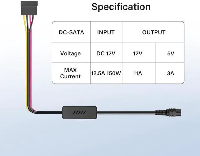 Step-down Voltage RegulatorDC5525 Female to SATA Female Power Supply Cable design with a step-down voltage regulator conversion board, convert 12V to 5V. Moreover, there are heat dissipation holes on the casing, which can make the cable performance more stable