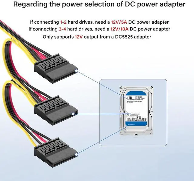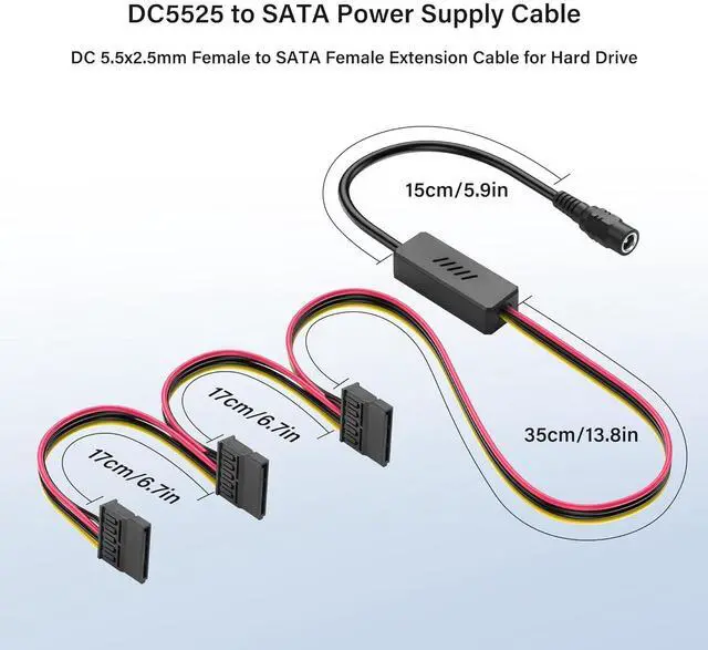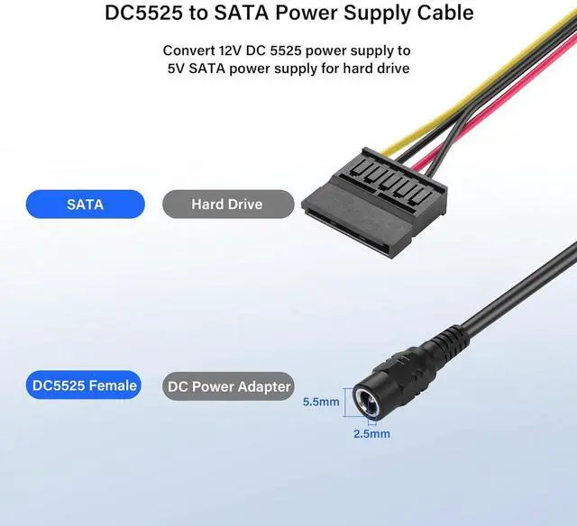 ConverterDC5525 to SATA Power Supply Cable can convert 12V DC 5.5x2.5mm power supply to 5V SATA Power Supply for Hard Drive.(Only supports 12V output from a DC5525 adapter)