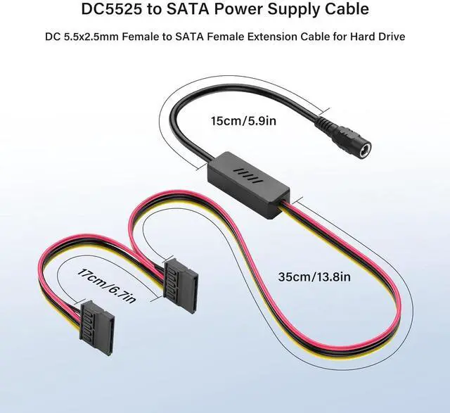 ConverterDC5525 to SATA Power Supply Cable can convert 12V DC 5.5x2.5mm power supply to 5V SATA Power Supply for Hard Drive.(Only supports 12V output from a DC5525 adapter)