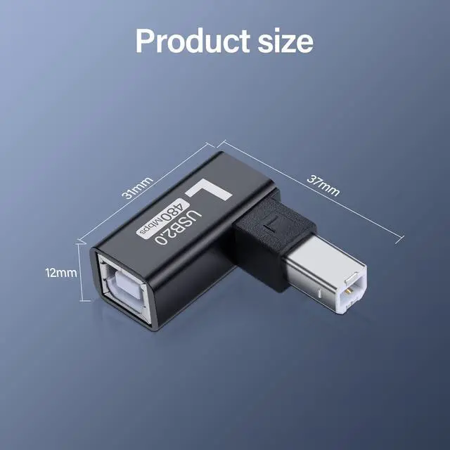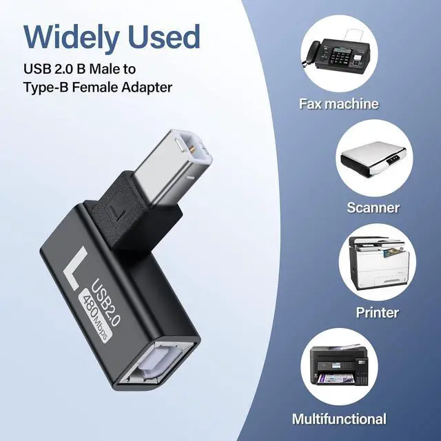 90° Angle Design:This USB B male to female adapter features a unique 4-direction (up, down, left, right) 90° angle design, perfect for tight spaces, walls, and corners. It helps avoid cable bending damage and extends the lifespan of your cables.