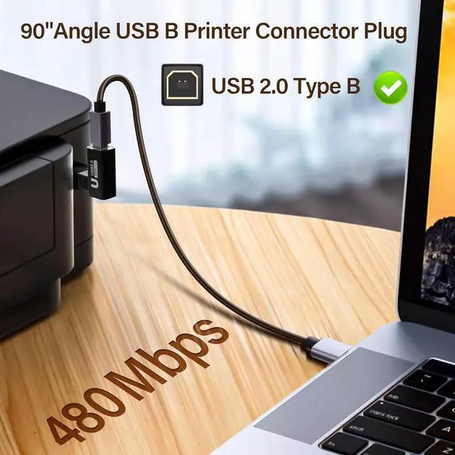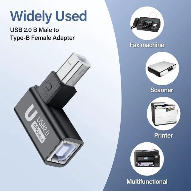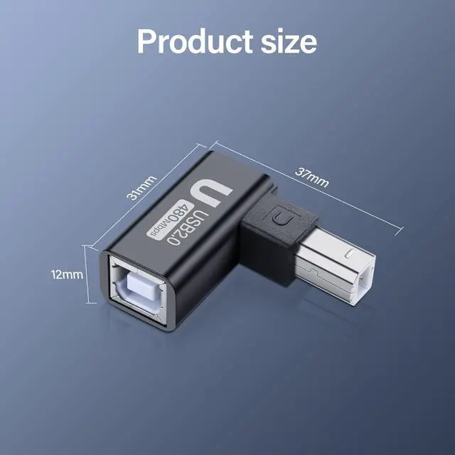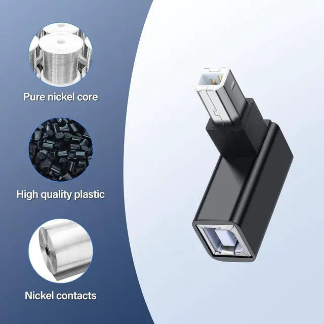 90° Angle Design:This USB B male to female adapter features a unique 4-direction (up, down, left, right) 90° angle design, perfect for tight spaces, walls, and corners. It helps avoid cable bending damage and extends the lifespan of your cables.