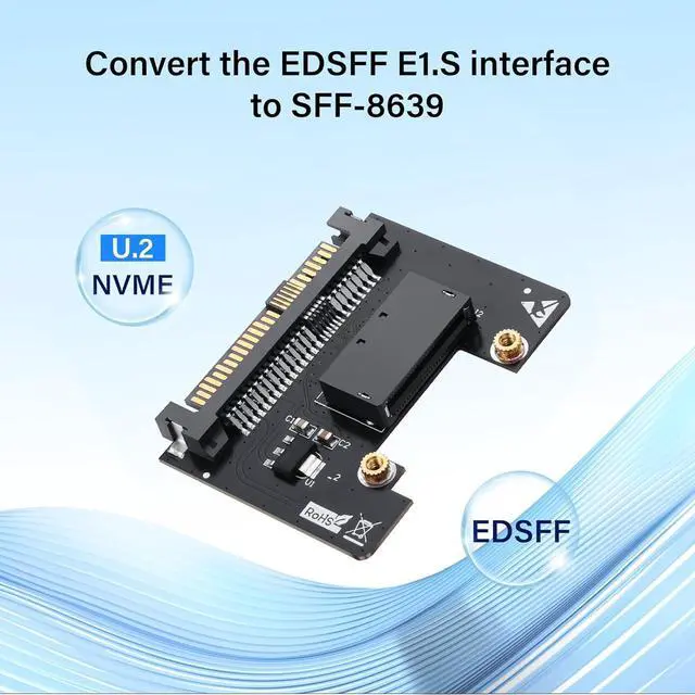 1. U.2 SFF-8639 host adapter converts EDSFF E1.S SSDs to U.2 SSDs for use in IoT, data centers and servers