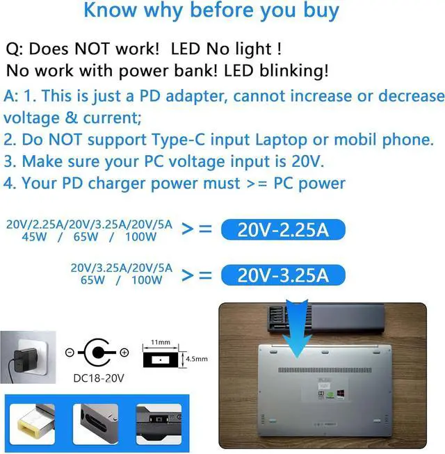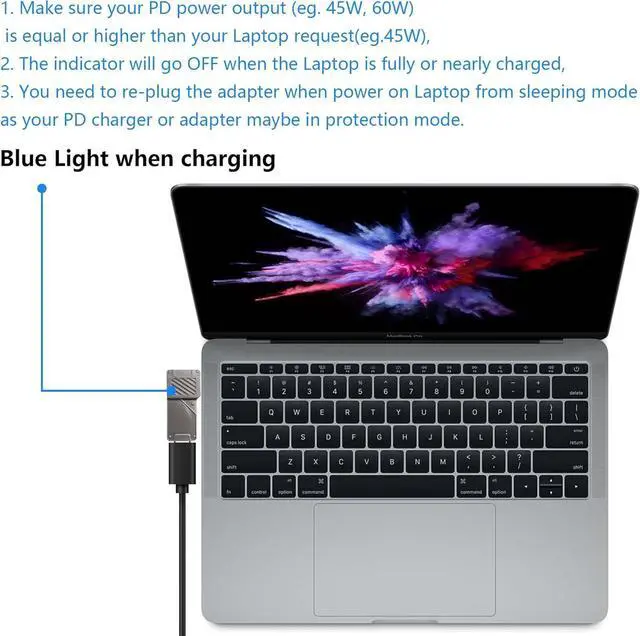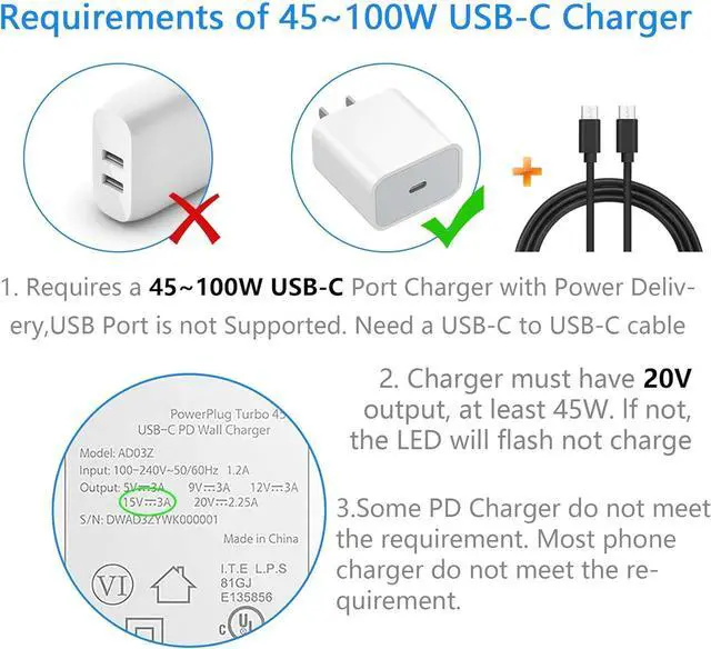 Note: This USB C adapter is only a conversion device, you need to provide the correct PD power output device and the correct USB C cable that supports PD. Please note that the power of the C-type charger must be greater than the output power. The PD power adapter should support 20V output. Not compatible with Rav PD charger and OS PD charger. Not compatible with PD power bank.