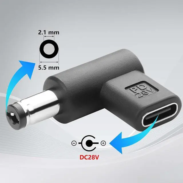 Connector: DC power connector adapter; USB C female to 5.5mm x 2.5mm male plug converter (aperture: 5.5mm, pin diameter: 2.1mm)