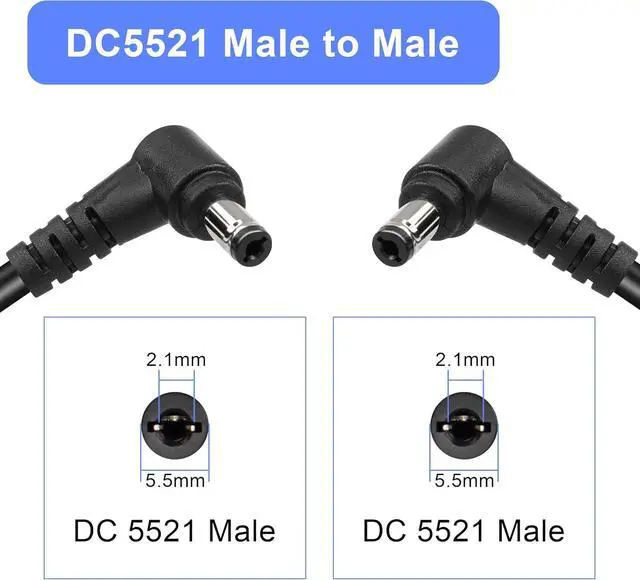 DC552190 degree Angle male head to male head: DC plug outer diameter 5.5mm, inner diameter 2.1mm. Connector 1: DC5521 male plug; Connector 2:DC521 right Angle 90 degree male plug; Cable size: 18 AWG; Cable length: 1m/39 inches (Note: including plug length)