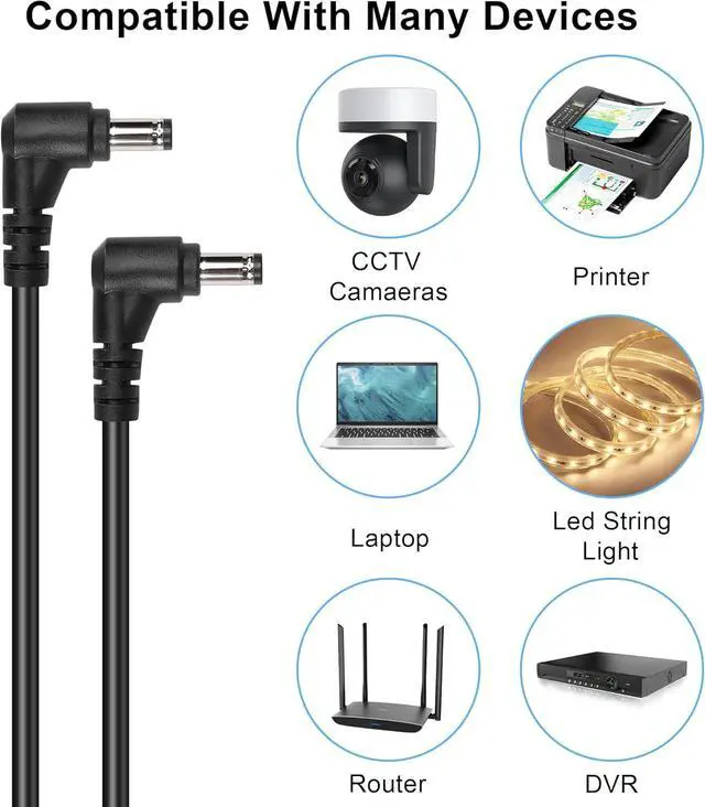 DC5521 90 degree Angle public to public cable, this power cord is suitable for all 5.5mm x 2.1mm plugs, such as light strips, CCTV surveillance cameras, cars, printers, DVR standalone, etc