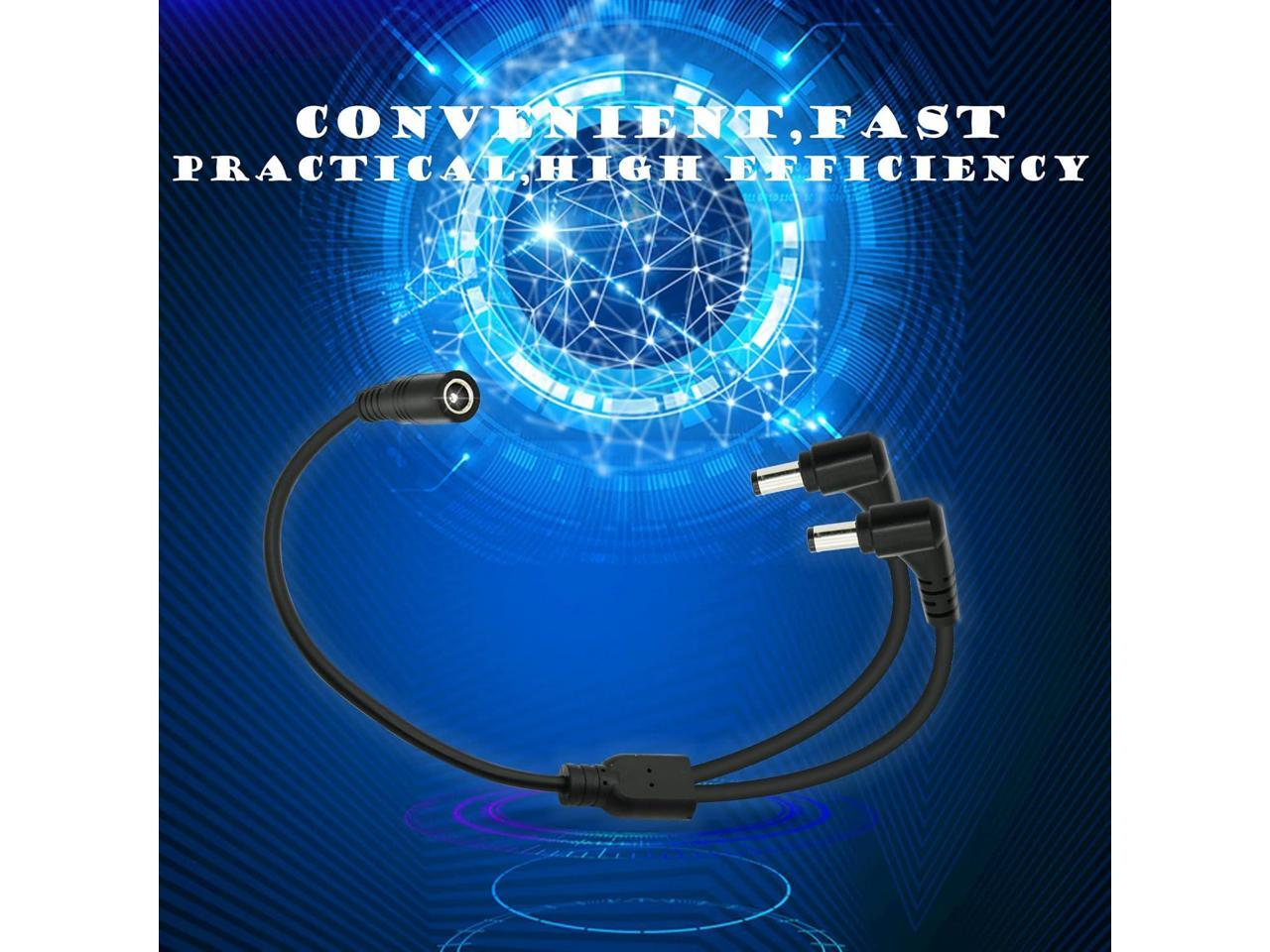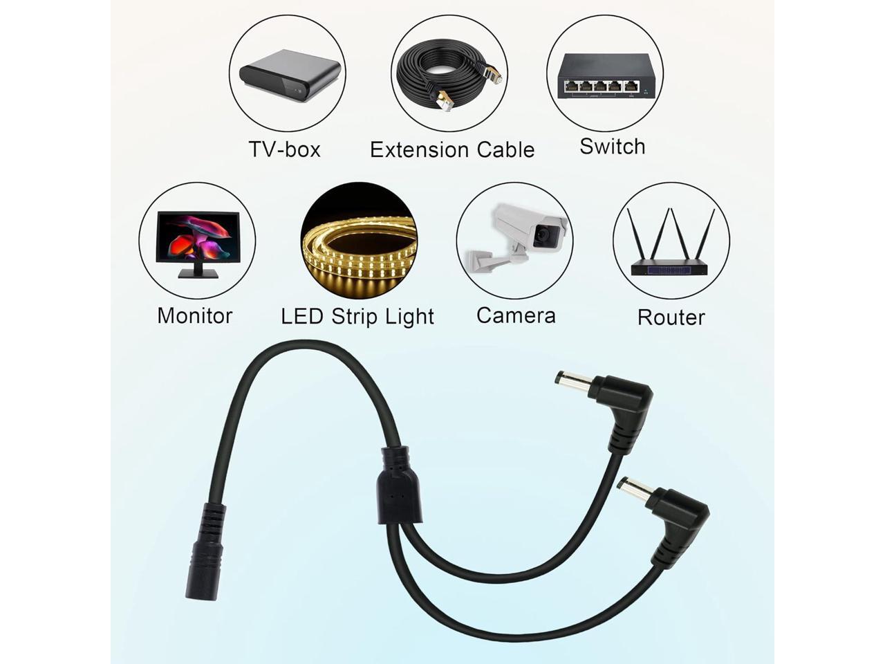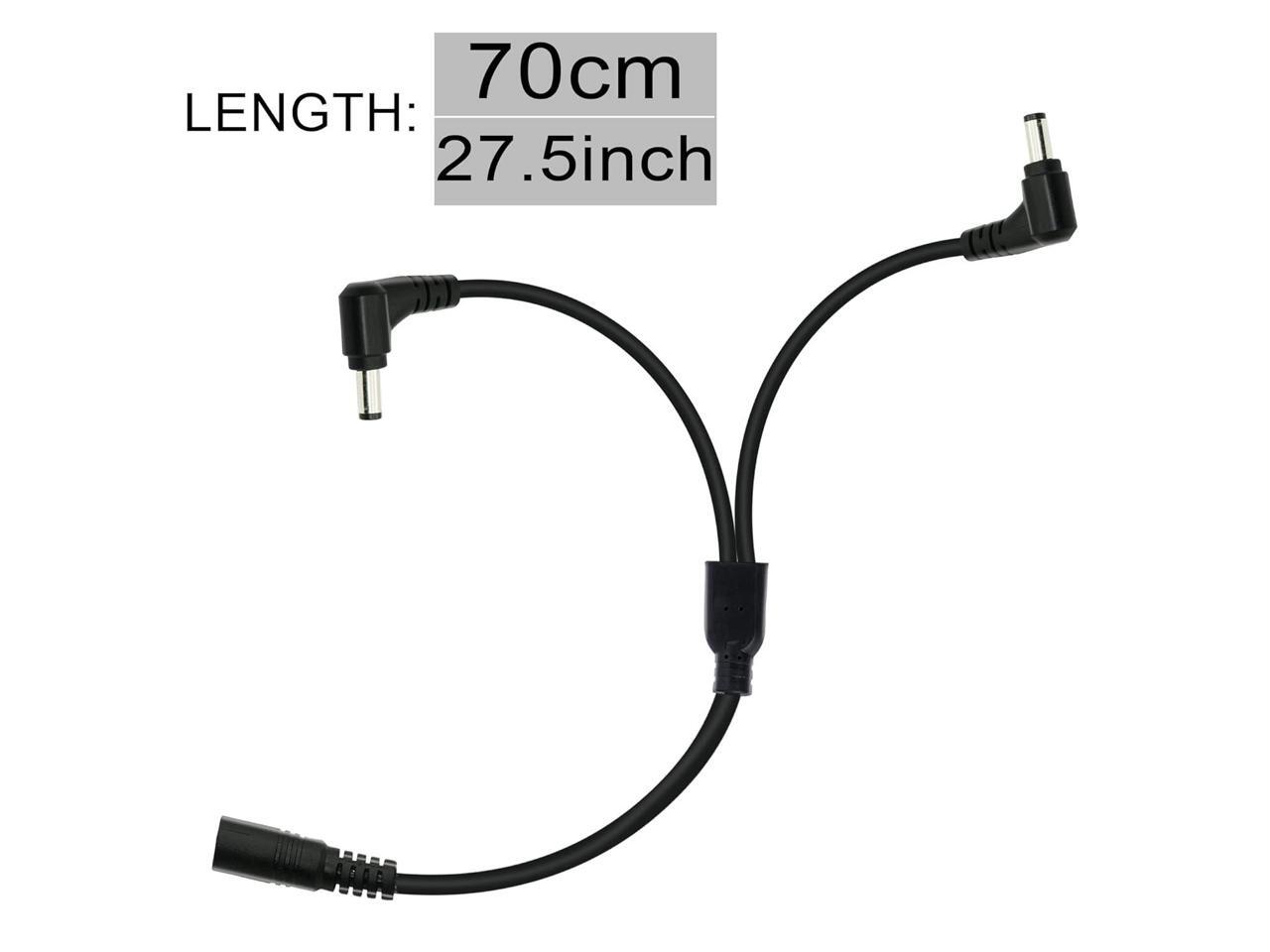 DC 5.5mm x 2.1mm 1 female to double 90 degree male Extension Cable total length is 0.7m. Main cable: 0.2m 18AWG 1-8A. Branch cable: 0.5m 18AWG 1-8A
