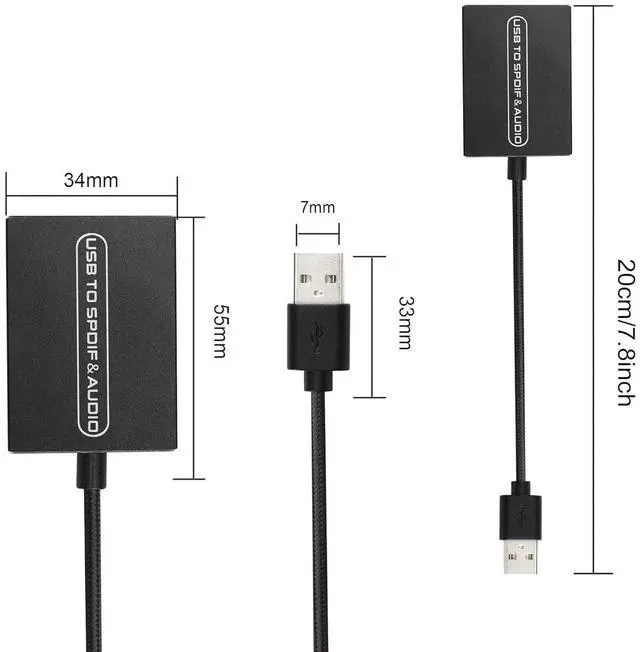 Input:USB 2.0 Male ;Output: Digital Fiber Optic Audio Jack + 3.5 mm audio jack;Cable length: 20 cm/7.8 inches