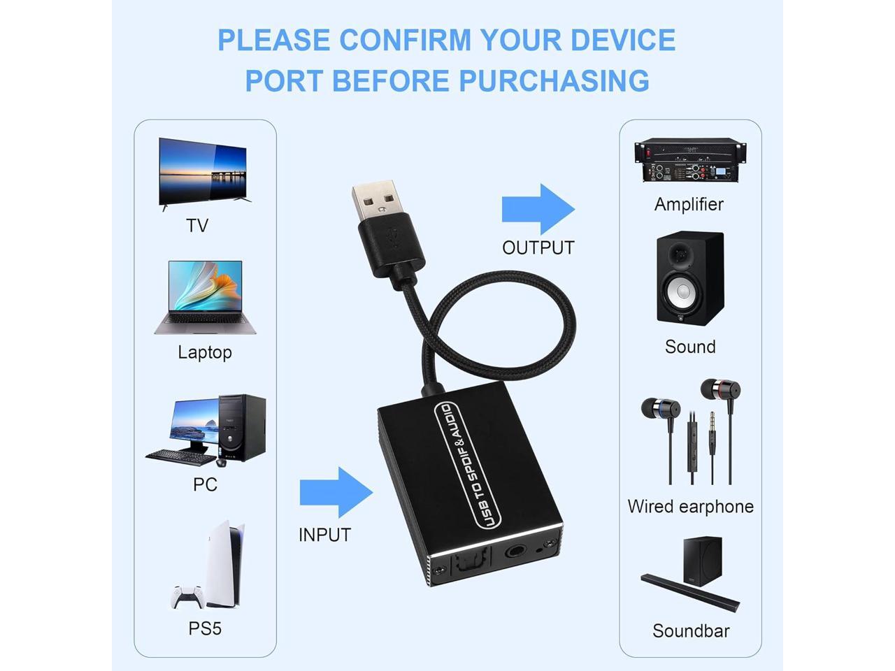 USB to Fiber Audio +3.5mm Audio converter, connect TV, PC, laptop PS4 and other devices via USB, extract audio to your amplifier, Soundbar, speaker