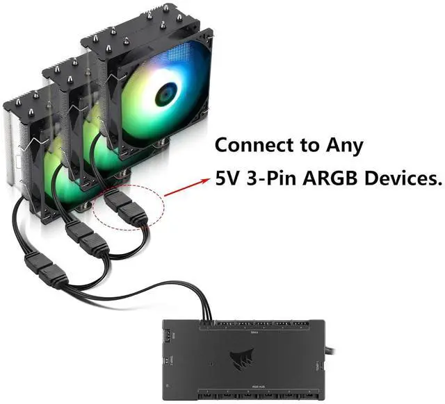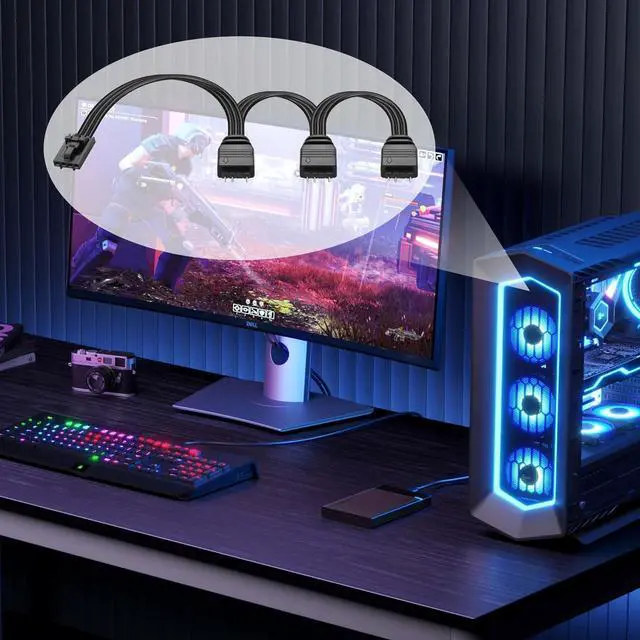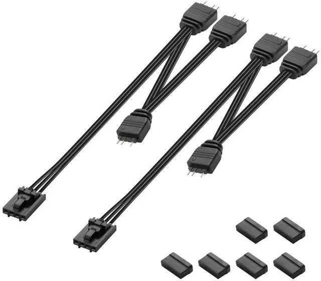 RGB fan splitter cable adopts a 1-to-3 design, which can convert a 4-pin commander female plug into three universal 5V 3-pin RGB male plugs to simultaneously power three RGB fans.