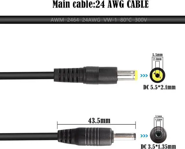 C5521 to DC35135 power cord is designed to convert the common DC5.5mm x2.1mm male plug into the rare DC3.5mm x1.35mm male plug for powering devices with DC3.5mm x1.35mm female port.