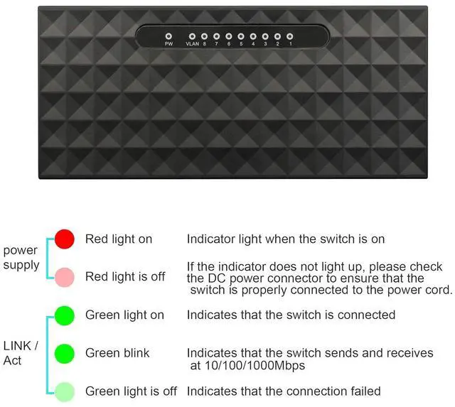LED Light Dynamic IndicationTHE LED indicator can show the running state of the switch. The connection power is on red, the access network line is on green, flashing indicates transmission, and if the corresponding indicator is not on, it means the connection has failed