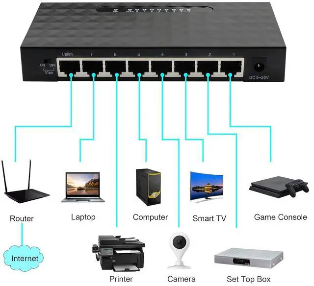 Support Desktop or Wall Mounted PlacementThe compact lightweight design can be used in narrow Spaces, can be placed on a desktop, or can be hung on a wall to save space, with a hanging design on the back of the switch.