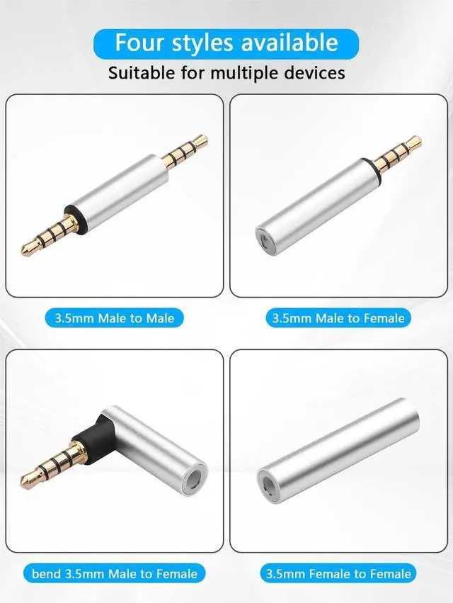 Four different styles of connectors provide functions such as adapter, extension, and angle conversion for 3.5mm audio devices