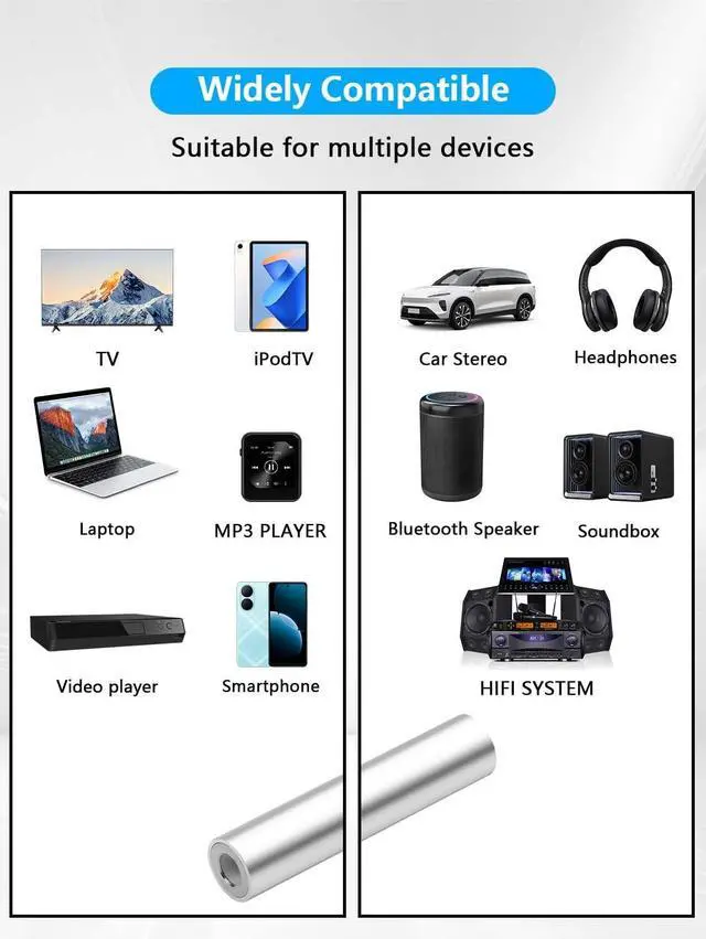 The 3.5mm male extension connector can connect headphones, MP3 players, and car stereo systems to Bluetooth transmitters or receivers, which is very convenient for connecting other devices.