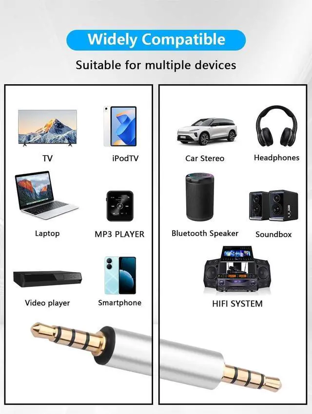 The 3.5mm male extension connector can connect headphones, MP3 players, and car stereo systems to Bluetooth transmitters or receivers, which is very convenient for connecting other devices.