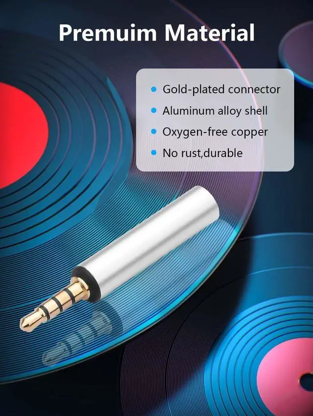 1/8 inch stereo male to male aluminum alloy connector. The integrated aluminum alloy shell is wear-resistant and scratch resistant. The 24K gold-plated plug provides faster audio signal transmission, ensuring stable audio transmission without delay.