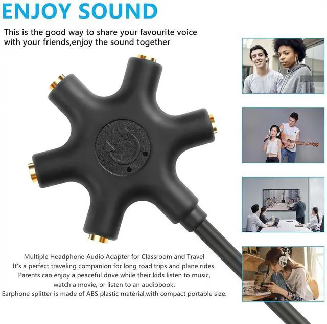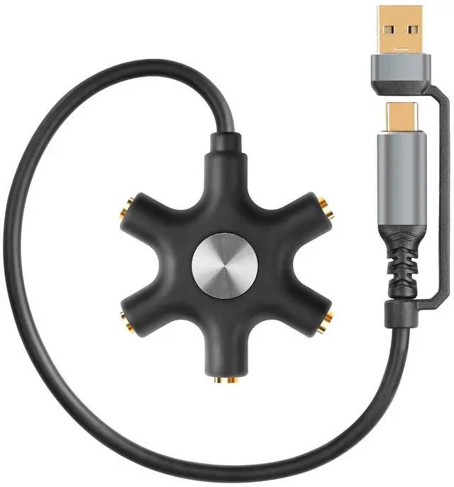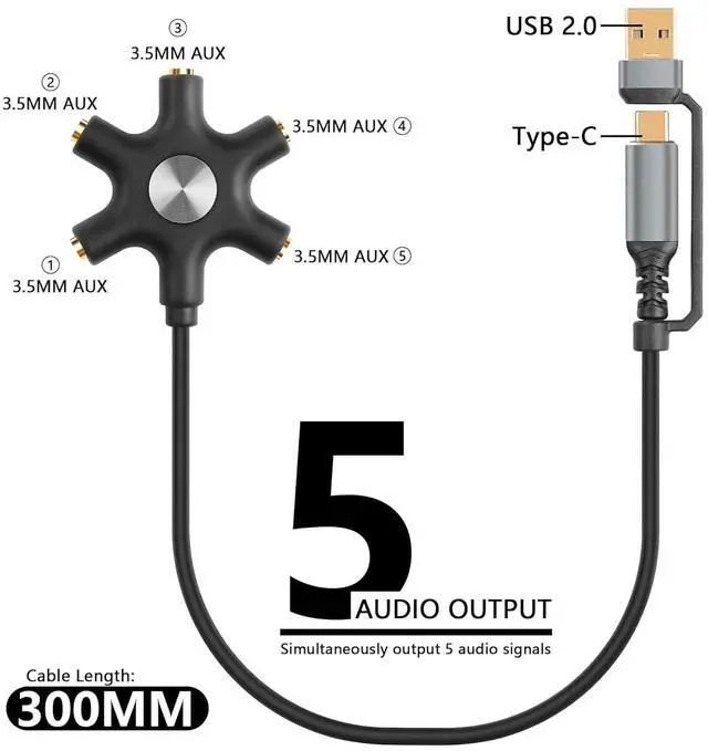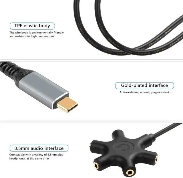 Audio Sharing Splitter Cable: usb to c 3.5mm headphone jack adapter 5-way audio sharing splitter cable meets the need for family or friends to share audio at the same time. Type-C to 3.5mm headphone divisor adaptador converts a single type-c male plug to five 3.5mm stereo female jacks, allowing 5 people to listen to audio from the same souce via a laptop or smartphone with a type-c connector.