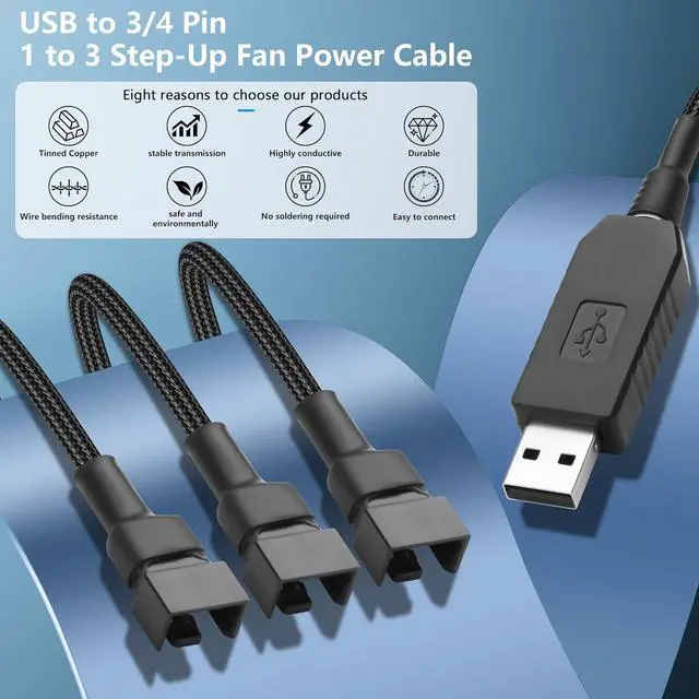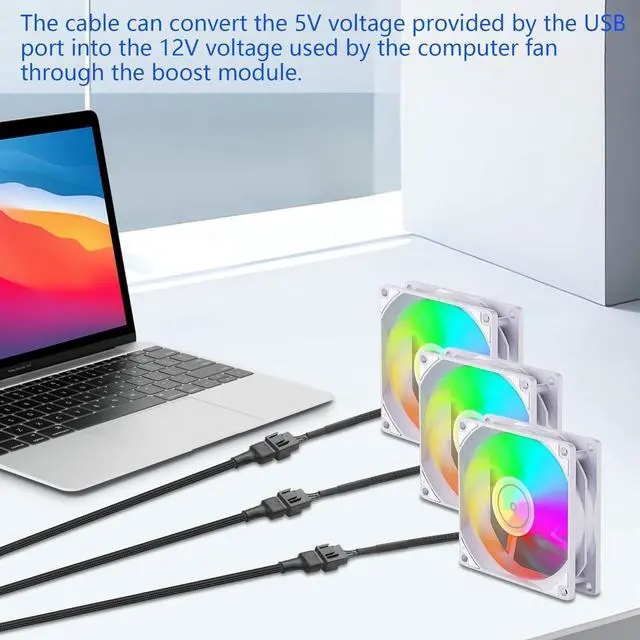 The USB to 3/4-pin step-up fan power cable can convert the DC5V voltage provided by the USB port into the DC12V voltage used by the computer fan through the boost module. The cable adopts a 1-to-1 design for expanding the connection of a single chassis fan.