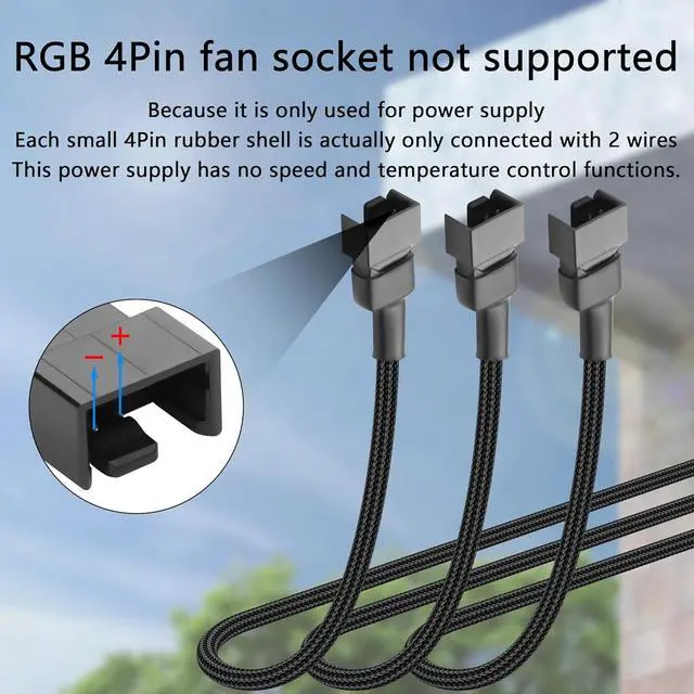Note:The 3/4-pin fan male plug of the cable is actually a 2-pin plug, compatible with 3/4-pin fan plugs. The cable only supports power supply and does not have PWM temperature control and speed measurement functions.