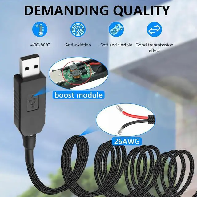 Connector 1: USB-A male plug(boost version); Connector 2: 3/4-pin fan male plug; Input: DC5V; Output: DC12V; Cable specification: 24AWG; Applicable current: 1.5A; Cable core: Tin plated copper; Insulation material: PVC; Type of woven mesh sleeve: PET woven mesh sleeve; Cable length: 54cm/21.26 inches (note: including plug length).