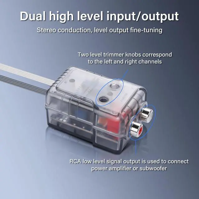 Used for the host without low frequency (RCA) output (eg: cassette player / card player / CD / VCD / DVD, etc.) will be the speaker output high-frequency conversion to low-frequency (RCA) output, used to connect the car power amplifier or subwoofer signal input