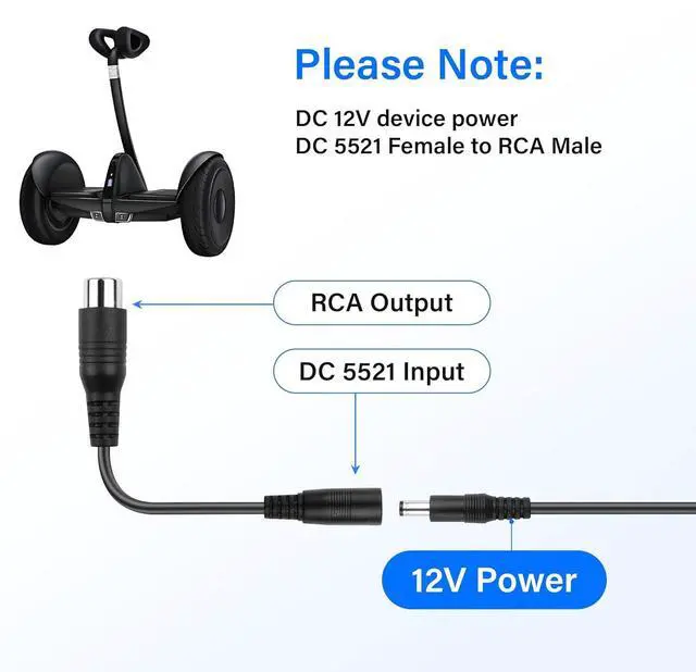 DC 5.5 x 2.1mm to 8mm RCA power cord is specially designed for balance bikes, electric scooters and some electric devices, adapts to most of the standard power adapters to meet various charging needs.