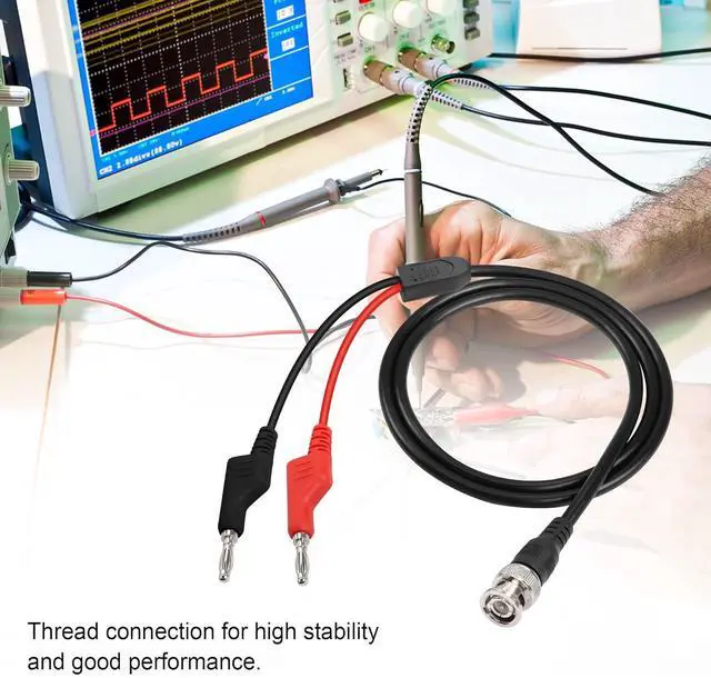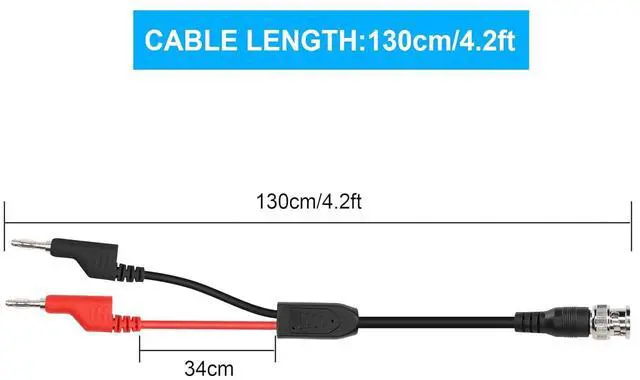 BNC male plug to dual banana plug cable can be used for all standard BNC interfaces, such as oscilloscopes, signal generators, video surveillance, etc. Application: Testing work