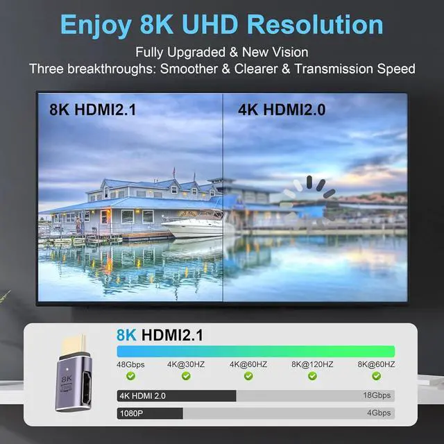 High Resolution:8K HDMI adapter provides a high-speed 48Gbps solution for better picture and sound, with resolutions up to 7680 x 4320 and 3840 x 2160 @ 120 Hz, supporting 48 Gbps 8K UHD video, 3D, 4K HDR, QHD 1440p, HD 1080p, eARC, 48 bit color depth, eARC, VRR, QMS, QFT, ALLM, DSC, Dolby TrueHD 7.1 audio