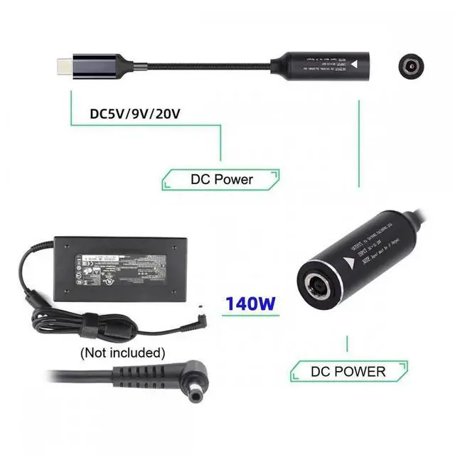 DC Jack 5.5 x 2.1 mm Input to USB-C Type-C Power 140W Smart LED Display Charge Cable for Laptop Phone PD9V 5V 20V7A
