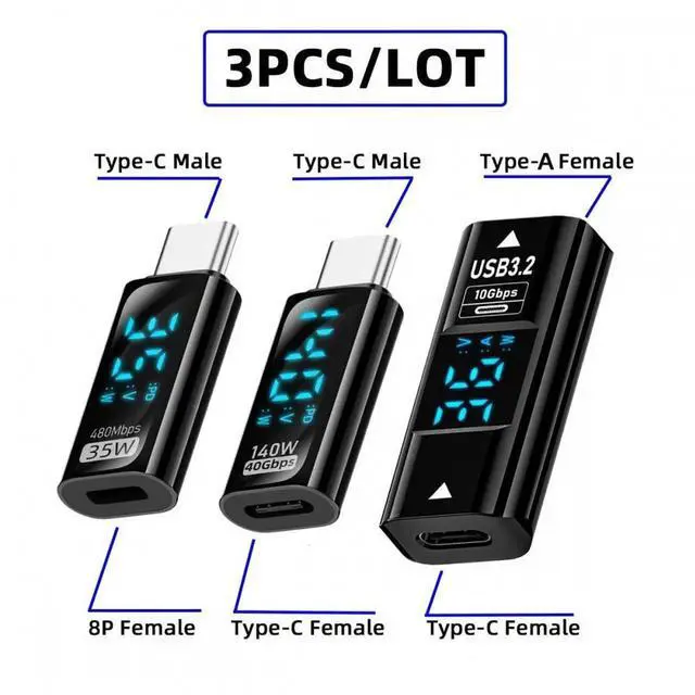 3pcs/lot Type-C Smart LED Display USB-C Female to USB Type-A 8P Adapter Data Current Voltage Fast Charging Monitoring Display Tester Detector