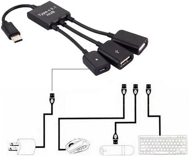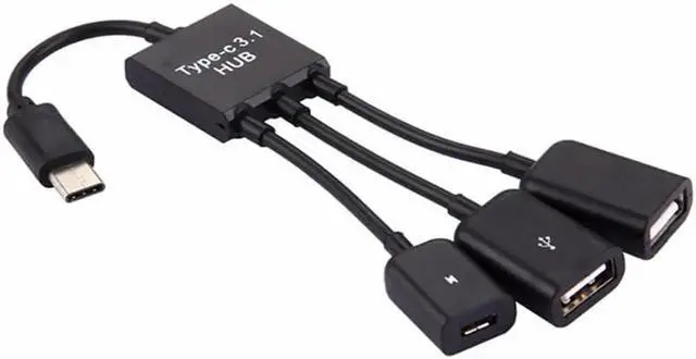 One Males Micro USB connects to one Micro USB female and Two USB 2.0 Female for external devices