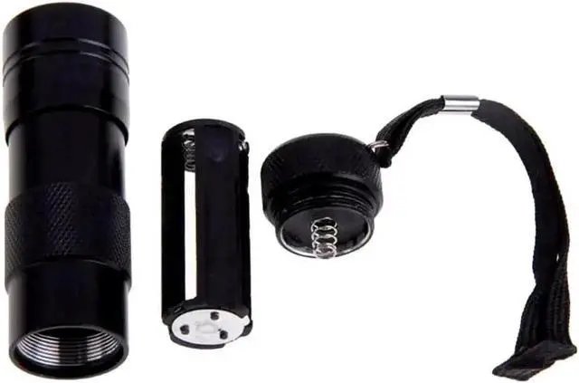 The flashlight emits a 395 nanometer wavelength light and is built with rugged, machined aluminum construction with a sleek design