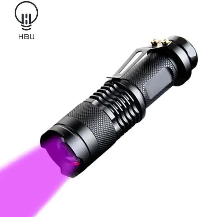 ultra-small size, ultraviolet flashlight. Anti-slip design and waterproof design. Adjustable focus range to suit different purposes, stretch to adjust its focus. Easy to carry clip. The working voltage is wide, and the battery can be used to the greatest extent. Suitable for hunting, cycling, climbing, camping and outdoor activities.