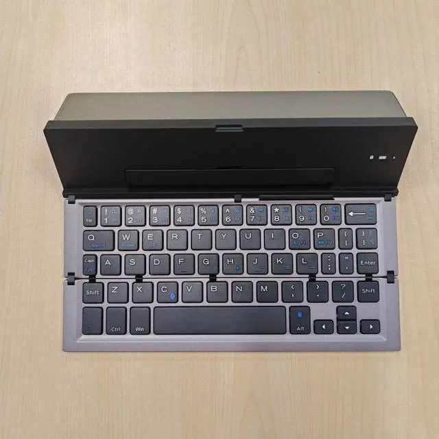 Triple-fold mobile tablet with aluminum body, Bluetooth keyboard, compatible with IOS, Android and Windows operating systems. Suitable for all three systems.