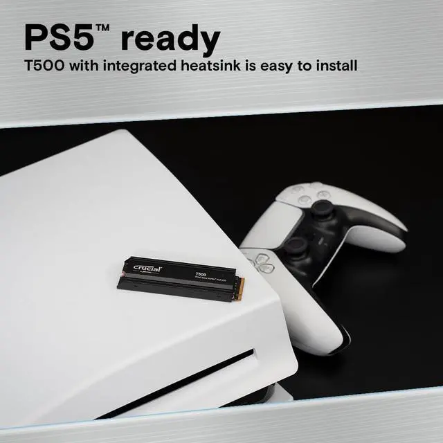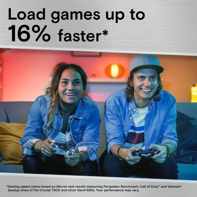 Fuel your system performance with the Crucial T500 Gen4 NVMe SSD. Load games up to 16% faster* with sequential read and write speeds** up to 7, 400MB/s and 7, 000MB/s (up to 1.18M / 1.44M IOPs random reads/writes**). Perfect for PS5, the T500 serves up faster gaming, video editing, and 3D rendering. Easy to install and with up to 2TB of storage***, the T500 gives you plenty of space for all your games or projects. Built with cutting-edge TLC NAND, up to a 40% performance-to-power ratio****, and speeds that are 2x faster***** than Gen3, the T500 optimizes your system performance so it can work faster with less power.