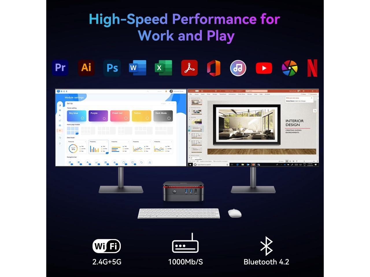 - Dual 4K Display Productivity - Transform your workspace into a productivity powerhouse. The Blackview MP60 supports dual HDMI 4K@60Hz outputs, allowing you to extend your desktop across two monitors for immersive multitasking. Perfect for financial analysis, creative design, coding, or simply enjoying ultra-high-definition movies, this mini computer delivers stunning visual clarity and maximizes your workflow efficiency.