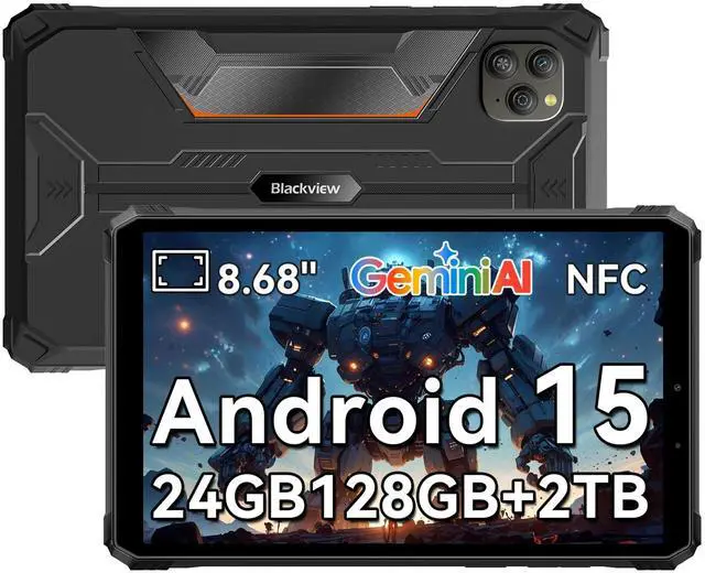 Gemimi AI Android 15 & 90Hz DisplayThe Blackview rugged tablet features an 8-inch 90Hz HD IPS screen, delivering sharp, clear, and smooth visuals. Running Android 15, it enhances privacy via
