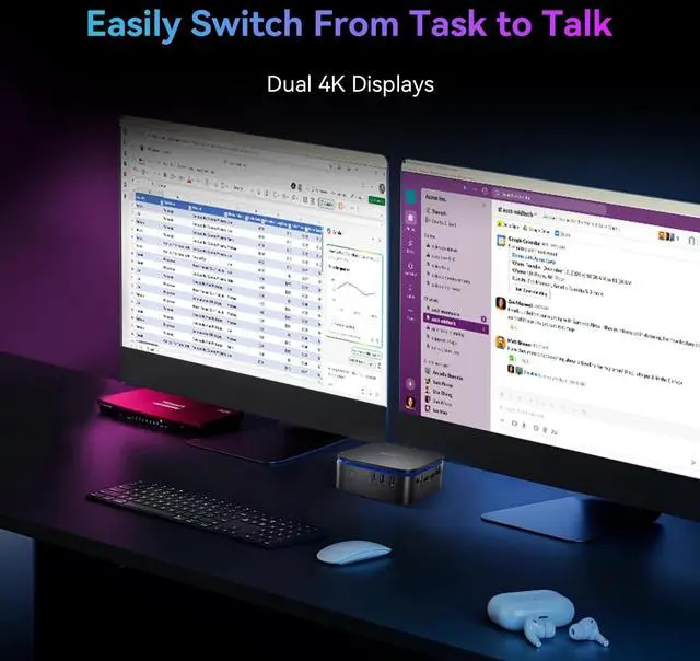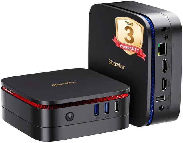 RJ45 port (theoretical: a 2h movie in 20 seconds - 85% faster than standard ports). Its dual-band WiFi ( 2.4 /5 GHz) guarantees stable connections even without cables. It connects a mouse, keyboard or projector via Bluetooth for wireless work. ^^ Dual 4K Monitors, Multitasking without switching back and forth - The mini desktop pc supports 4K output on two screens via two HDMI ports - ideal for financial data, designs or surveillance monitors. It manages multiple HD cameras on one device and saves you expensive security technology. ^^ Newly upgraded cooling system - The desktop computer is equipped with the cooling system developed by Blackview that includes improved heat-conducting materials and cooling fans to effectively manage the case temperatures. The heat dissipation area can reach 16800m. In addition, the specially optimized fan blades reduce noise level by 40% compared to similar products, so you can focus on your work without being distracted by excessive noise. ^^ Flexible OS & 3-Year Warranty The MP60 mini desktop comes ready to use out of the box with a pre-installed operating system, while offering full compatibility with Ubuntu Linux, and FydeOSgiving you the freedom to switch to your preferred OS effortlessly.