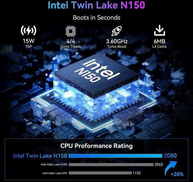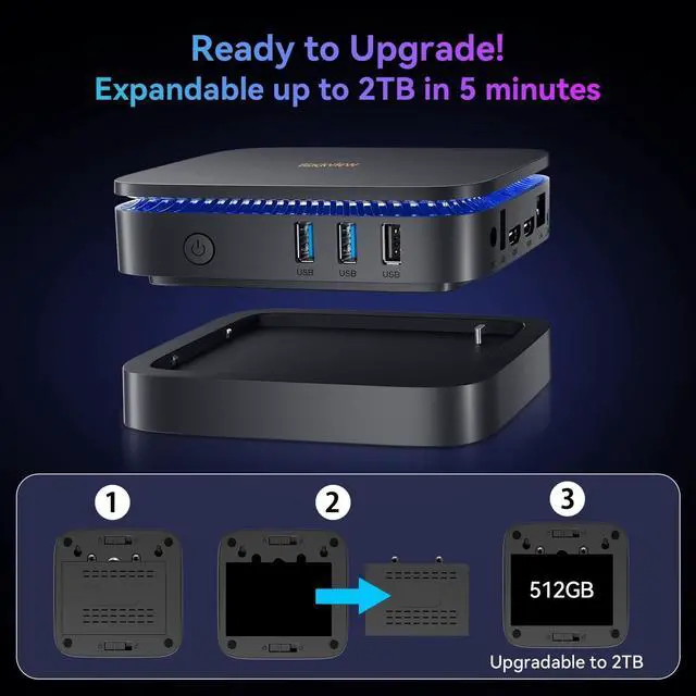 Compact Size, Peak Performance - The Blackview MP60 Mini PC packs the newest Intel N150 processor (4C/4T, 6MB cache, up to 3.6GH z) into an ultra-compact chassis ( 4.6" 4.4" 1.34", 0.85 lbs), effortlessly handling daily tasks like web browsing, document editing, and video callsperfect for remote work or online classes. An intuitive LED status indicator provides at-a-glance monitoring - glowing blue when powered on and shifting to red in sleep mode. ^^ No More Storage Problems, Upgrade Ready - The Win 11 Pro Mini PC offers easy retrofitting of additional SSD storage (256GB - 2TB) thanks to its modular design.