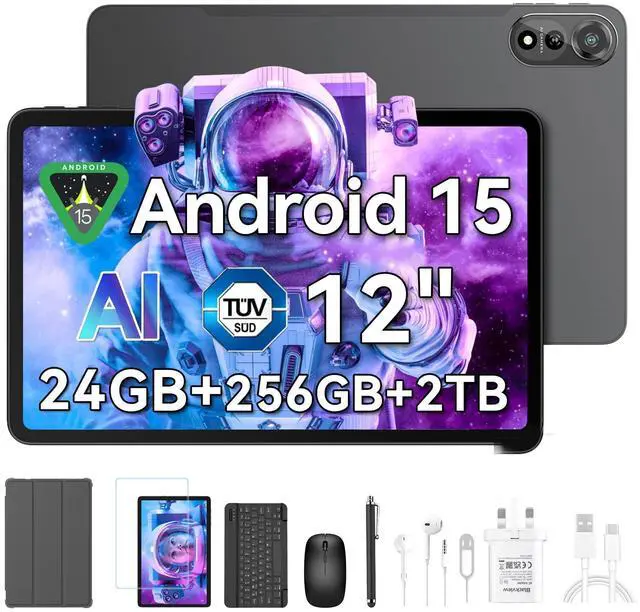 Smart Gemini AI system: Blackview 12-inch Android 15 tablet your all-in-one solution for work, gaming, study, and creative tasks. With the latest Android 15 system enhanced by Gemini AI, you get a smooth, intelligent and highly responsive user experience, ideal for productivity and entertainment. ^^ 9000 mAh battery + 33W fast charging + full accessory set: The large 9000 mAh battery ensures long hours of usage for work, learning, or multimedia. With 33W fast charging, the device powers up quickly, keeping you productive. Comes with keyboard, mouse, pen, and protective case turning the tablet into a powerful laptop-like workstation. ^^ 5G WiFi + SIM Card Slot + GPS +