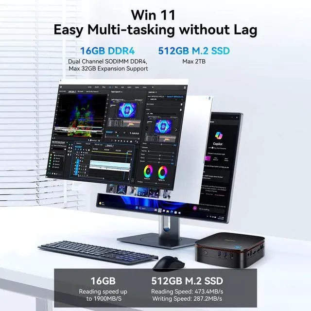 Powerful Performance for Multitasking - Experience a new level of efficiency with the latest Twin Lake N150 CPU(up to 3.6GH z, 4C/4T, 6MB L3 Cache), delivers more than 39% higher performance than N100/N95. The Blackview MP60 mini PC is equipped with 16GB DDR4 RAM, it handles your daily workloadfrom complex spreadsheets and numerous browser tabs to video conferenceswith effortless ease. The 512GB (up to 2TB) PCIe SSD delivers lightning-fast boot times and rapid file access, ensuring a smooth and responsive experience for all your home office needs. ^^ Dual 4K Display Productivity - Transform your workspace into a productivity powerhouse.