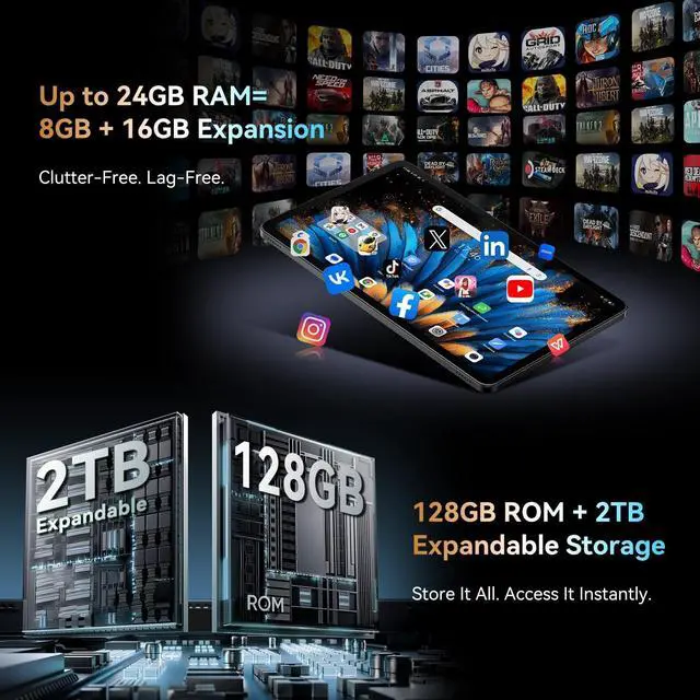 Gemini AI operating system: Blackview 2025 tablet your versatile companion for work, gaming, and creative projects. Equipped with the modern Android 15 operating system and Gemini AI, this android tablet with keyboard delivers a smooth, intelligent, and user-friendly experience. As a large tablet, it provides strong performance and an efficient interface for daily productivity. The optimized system ensures this 12 inch tablet responds quickly and handles multitasking with ease. ^^ 24 GB RAM + 128 GB ROM (expandable up to 2TB): Powered by a high-performance processor with Gemini AI optimization, the tablet offers 24GB(8GB+16GB) RAM and 128GB internal storage, expandable up to 2TB. Its strong performance allows this android tablet with keyboard to run multiple apps efficiently while storing games, videos, documents, and creative projects. With powerful processing capability, it serves well as a large tablet for both work and home use, supporting the smooth operation expected from a premium 12 inch tablet. ^^ 12+ inch 2K