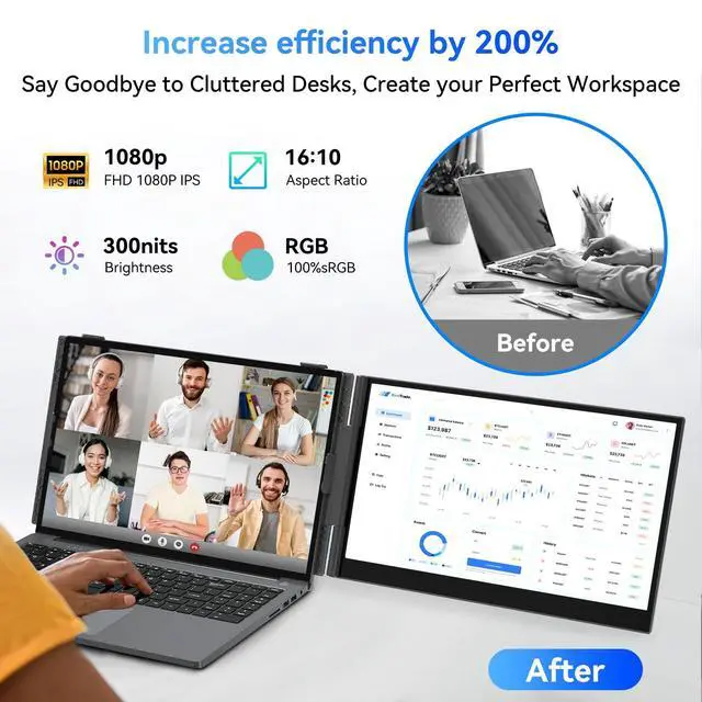 ^^,: The 15.6" Full HD external laptop portable monitor extender delivers extraordinary image quality with 1920x1200 resolution, 16:10 aspect ratio, 60Hz refresh rate, 300 nits brightness, and 100% sRGB color gamut. Supports adjustment of brightness, contrast, backlight, and other parameters. This second screen for laptop portable provides multiple display modes[Mirror/Extension/Landsape & Portrait] & 180 rotation.