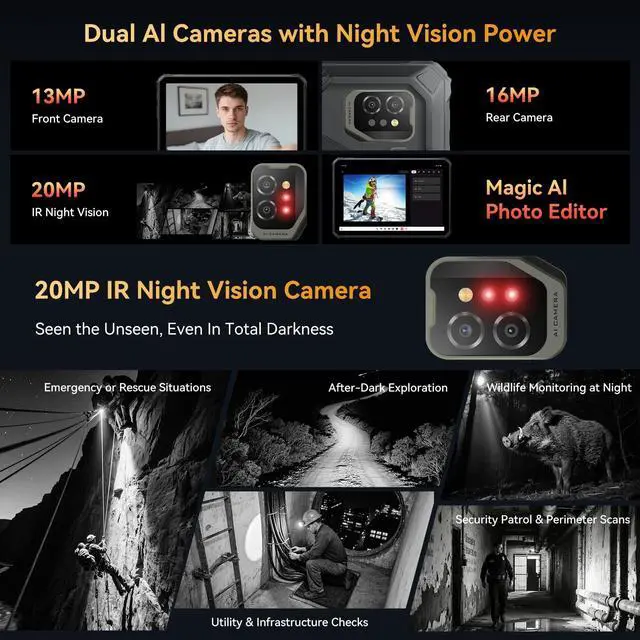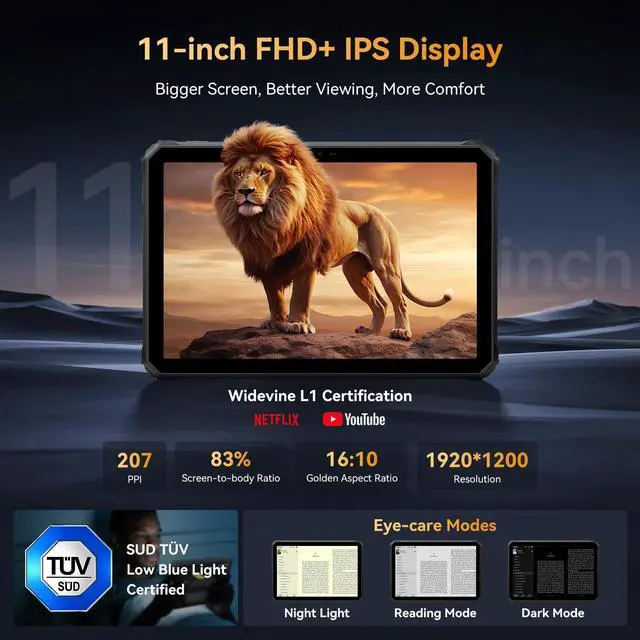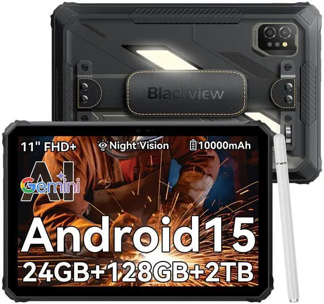[AI Rugged Tablet with Night Vision + 10000mAh Battery] Our rugged tablet features a powerful AI-driven night vision camera, illuminating the unseen and capturing clear details in total darkness. Perfect for hiking in the wild at dusk or navigating a dimly lit campsite. Combined with a massive 10000mAh battery, it provides extended power to keep you connected and documenting adventures in long time ^^ [11" FHD+ Display + PC Mode 2.0 ] The blackview rugged tablet active 7 features an 11" FHD+ display with a resolution of 1200x1920, ideal for reviewing detailed map or presentation slides.