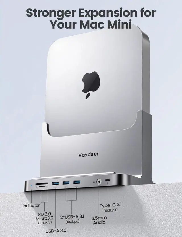 VAYDEER Mac Mini Stand Silver ABS Plastic Dock for Mac Mini, 8-in-1 Dock Station Holder with Power Adapter, USB 3.0 Ports/Type C Hub for Data Transfer TF/SD Card Reader HDD/SSD Slot Audio Jack