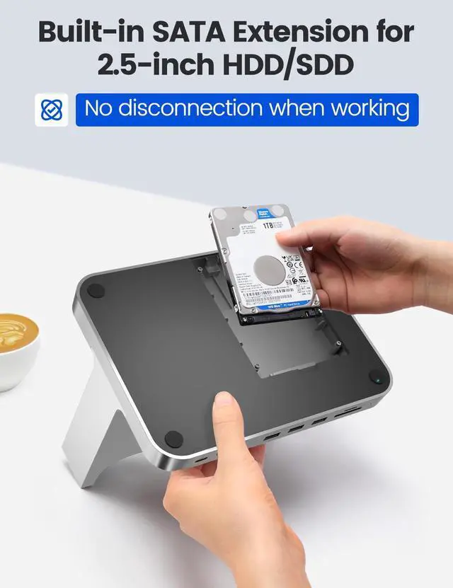[(8-in-1 Extra USB Ports)] This Mac Mini dock station is a great addition to your Mac Mini. It expands Mac Mini's more accessible connectivity, including 1 x USB 3.0 port, 2 x USB 3.1 ports, 1 x Thouderbolt(USB3.1), 1 SD Card slot and 1 TF Card slot. There is also a built-in SATA for 2.5 inches HDD/SSD, and a 3.5mm audio jack for Mic and headphone. The stand puts extra ports at the front, so that you don't have to go fiddling around at the back of your Mac to connect devices.